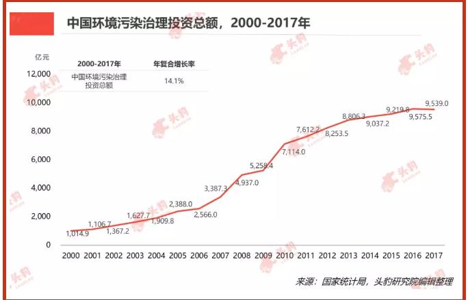 進入21世紀之后,中國環(huán)保行業(yè)進入快速發(fā)展階段,環(huán)保投入出現(xiàn)跨越式增長。中國經(jīng)濟高速發(fā)展的同時,中國生態(tài)環(huán)境日益嚴峻,政府逐漸將工作重心放到生態(tài)文明建設上。黨的十八大以來,中國出臺并落實了《關于加快推進生態(tài)文明建設的意見》、《生態(tài)文明體制改革總體方案》、《大氣污染防治行動計劃》、《水污染防治行動計劃》、《土壤污染防治行動計劃》等40多項涉及生態(tài)文明建設方案,中國環(huán)保事業(yè)進入新的高度。在政府的大力支持下,中國環(huán)境污染治理投資總額從2000年的1,014.9億元增長到2017年的9,539.0億元,年復合增長率達到14.1%。