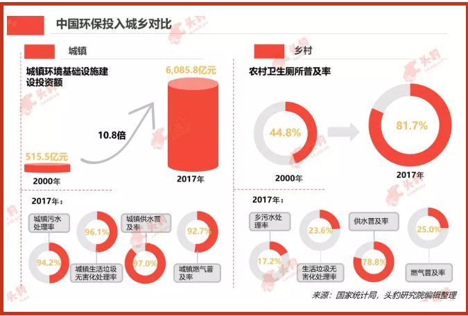 城鎮(zhèn)方面,中國城鎮(zhèn)環(huán)境基礎設施建設投資額從2000年的515.5億元增長到2017年的6,085.8億元,增長了10.8倍。2017年,中國城鎮(zhèn)(城市+縣城)污水處理率94.2%,城鎮(zhèn)生活垃圾無害化處理率96.1%,城鎮(zhèn)供水普及率97.0%,城鎮(zhèn)燃氣普及率92.7%。鄉(xiāng)村方面,中國農(nóng)村衛(wèi)生廁所普及率從2000年的44.8%增長到81.7%,2017年,中國鄉(xiāng)污水處理率17.2%,生活垃圾無害化處理率23.6%,供水普及率78.8%,燃氣普及率25.0%。中國鄉(xiāng)村市政公用設備仍有較大提升空間。