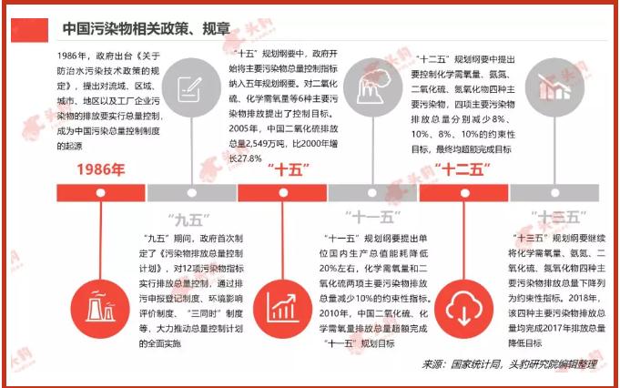 污染物減排是改善環(huán)境質量最直接的手段,政府持續(xù)發(fā)布政策控制污染物排放量,取得了顯著成果。1986年,政府出臺《關于防治水污染技術政策的規(guī)定》,成為中國污染總量控制制度的開端?!熬盼濉逼陂g,政府首次制定了《污染物排放總量控制計劃》。“十五”規(guī)劃綱要中,政府首次將主要污染物總量控制指標納入中國經(jīng)濟社會發(fā)展規(guī)劃綱要。之后的“十一五”規(guī)劃綱要、“十二五”規(guī)劃綱要、“十三五”規(guī)劃綱要中,政府繼續(xù)提出主要污染物總量控制指標,并均超額完成目標,中國在污染物總量控制方面成效明顯。