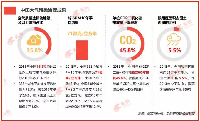 (2)大氣污染治理是近年來中國環(huán)保事業(yè)的重點,自2013年國務院印發(fā)“大氣十條”,提出了10條35項大氣綜合治理措施以來,中國大氣污染治理逐漸進入快速車道,治理效果逐年提升。2018年,全國35.8%的地級及以上城市空氣質量達標,338個城市PM10年平均濃度為71微克/立方米,中國單位GDP二氧化碳排放較2005年降低45.8%,全國酸雨區(qū)面積占國土面積的5.5%,較2013年少了5.1%。