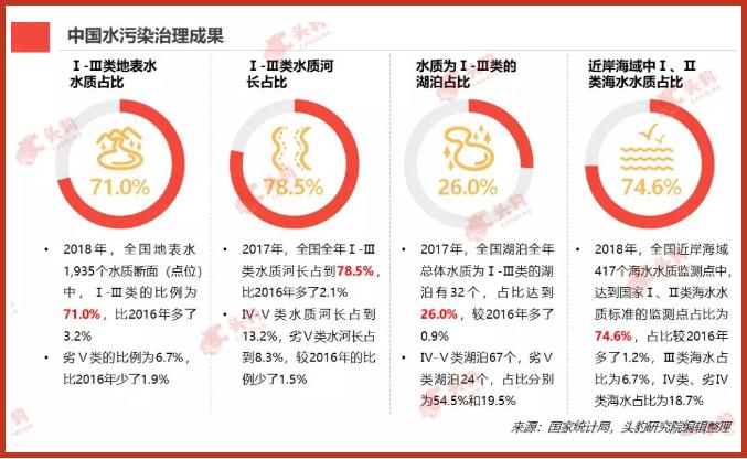 (1)水污染治理是中國環(huán)保行業(yè)最大的細分領域之一,資金投入多,中國地表水、河流、湖泊、近岸海域水質因此持續(xù)改善。2018年,全國全年Ⅰ-Ⅲ類地表水水質占比為71.0%。2017年,全國全年Ⅰ-Ⅲ類水質河長占比為78.5%,全國全年水質為Ⅰ-Ⅲ類的湖泊有32個,占比達到26.0%。2018年,達到國家Ⅰ、Ⅱ類海水水質標準的近岸海域海水水質監(jiān)測點占比達到74.6%,中國地表水、河流、湖泊、近岸海域的優(yōu)質水質占比較往年均有所提升。