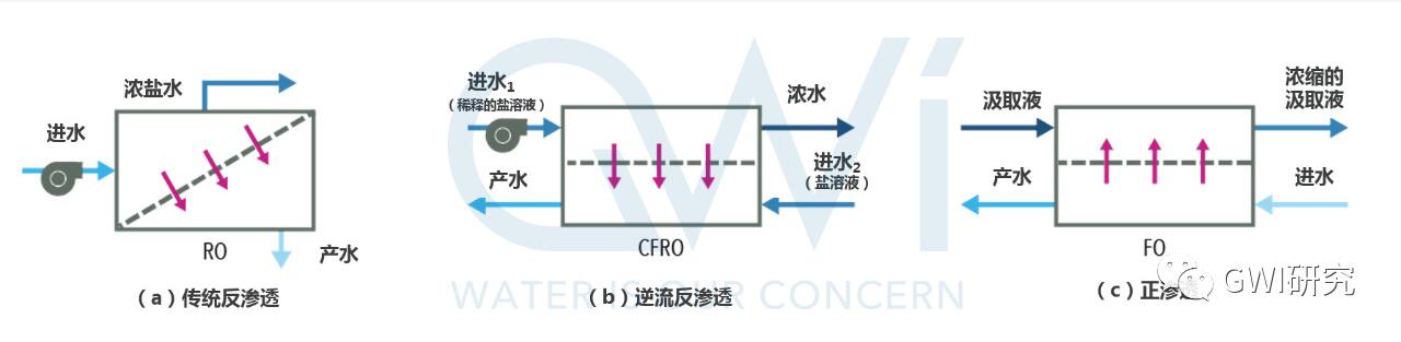 常見的標準RO、逆流RO和正滲透FO三者的滲透原理區(qū)別如下圖所示。而這兩項技術(shù)則是通過利用不同滲透壓(正滲透與反滲透)的原理,在反滲透膜出水端添加少量鹽溶液,以維持RO膜進料端和滲透端的鹽水濃度,從而有效降低膜兩側(cè)的壓力差。通過這一新興的鹽濃縮蒸發(fā)設(shè)備和多級串聯(lián)的處理,出水濃度可高達250,000 mg/L TDS。這樣一來,系統(tǒng)在進行濃縮的同時,其所消耗的外加壓力也相應(yīng)降低,同時實現(xiàn)了節(jié)能的目的。