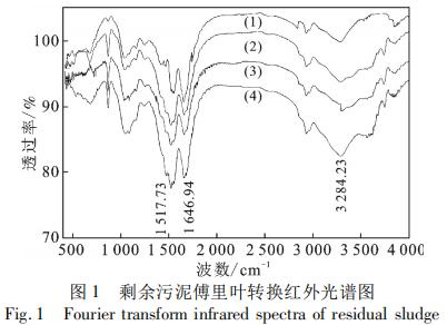 PAM、PAM 和 FeCl3 最佳投加比聯用、PAM 和 Al2 (SO4 )3 最佳投加比聯用,分別處理污泥,不同投加條件下剩余污泥傅里葉轉換紅外光譜圖見圖 1。